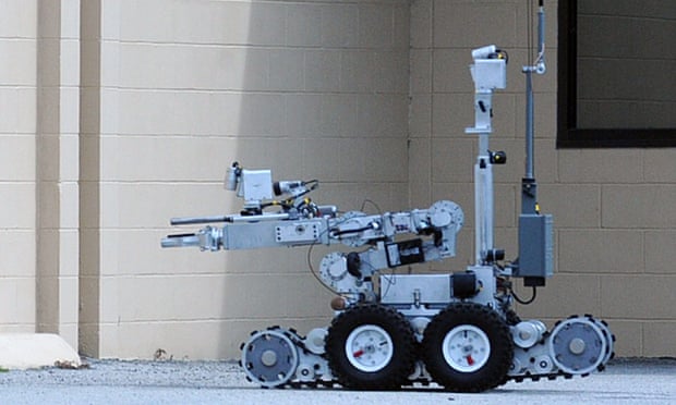 DYI Comments: No doubt Micah Johnson now deceased is guilty as sin. I want to be very clear about that. However, there is a very disturbing trend regarding the militarization of our police departments. The shooter was clearly boxed in on the second floor of the community college from which he could not escape. All they had to do was clear the building of all innocents, lock down adjoining rooms with cops, cut off electricity and water, and wait him out. This is not second guessing - it is STANDARD PROCEDURE. Rather than wait him out they mounted a bomb on a robot and blew him up avoiding all of those legal hassles, you know, "due process."